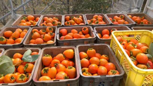 用日本果園裡獨有的電輪車裝上一箱又一箱滿滿的柿子