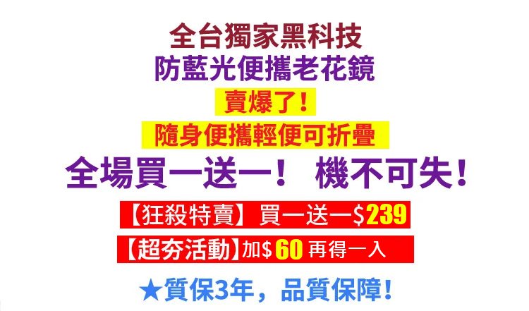 半小時前防藍光便攜老花鏡 火爆熱銷中!官方正品,免費試用,24小時在線客服,不好用直接退!售後無憂! - 【超值優惠】折扣價2入組NT$1198
