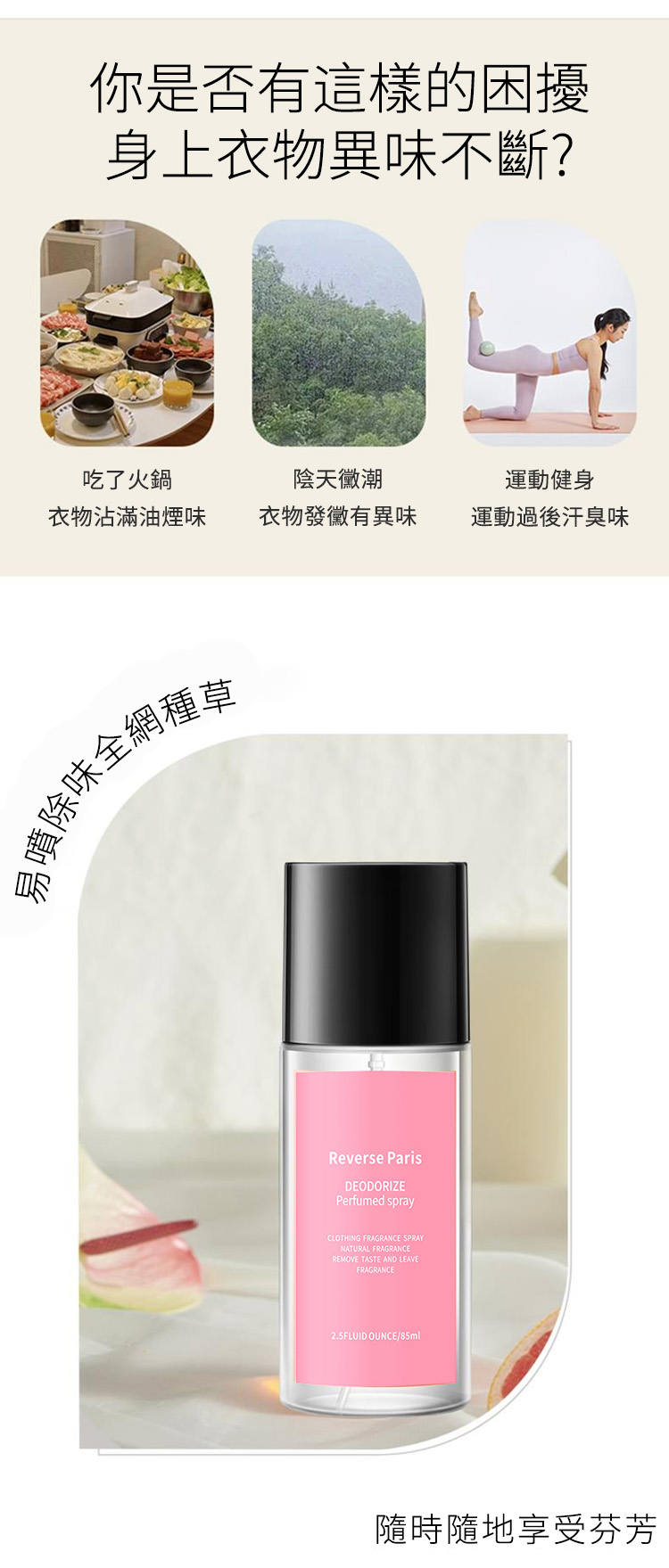 半小時前【衣物香氛喷雾】不用洗衣服,也能去除衣服異味。一噴就香,留香持久,讓衣服擁有自然體香。 - 【買4送4 】8入組 NT$1598